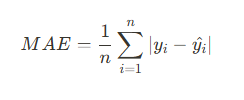 MAE = \frac{1}{n}\sum\limits_{i=1}^n{\left\vert y_i - \hat{y_i} \right\vert}