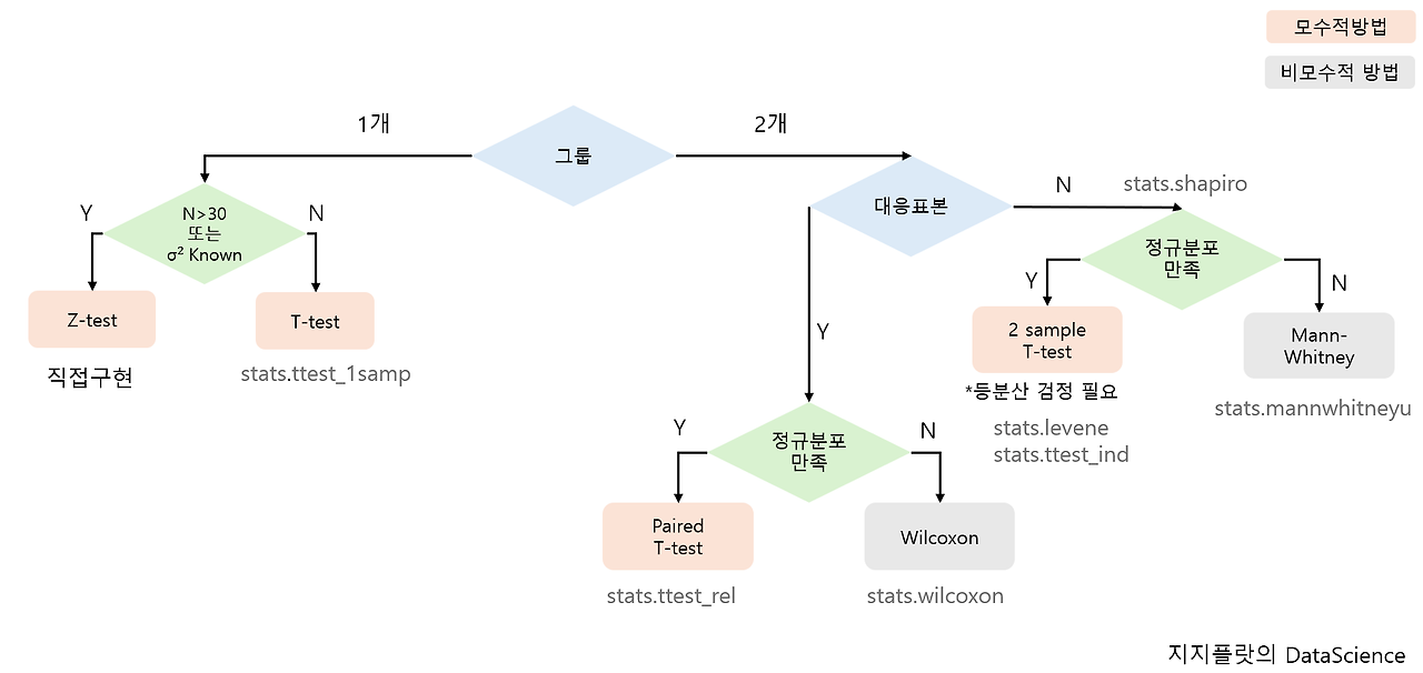 - t-검정(t-test): 두 그룹의 평균이 다르다는 것을 비교하는 통계 방법