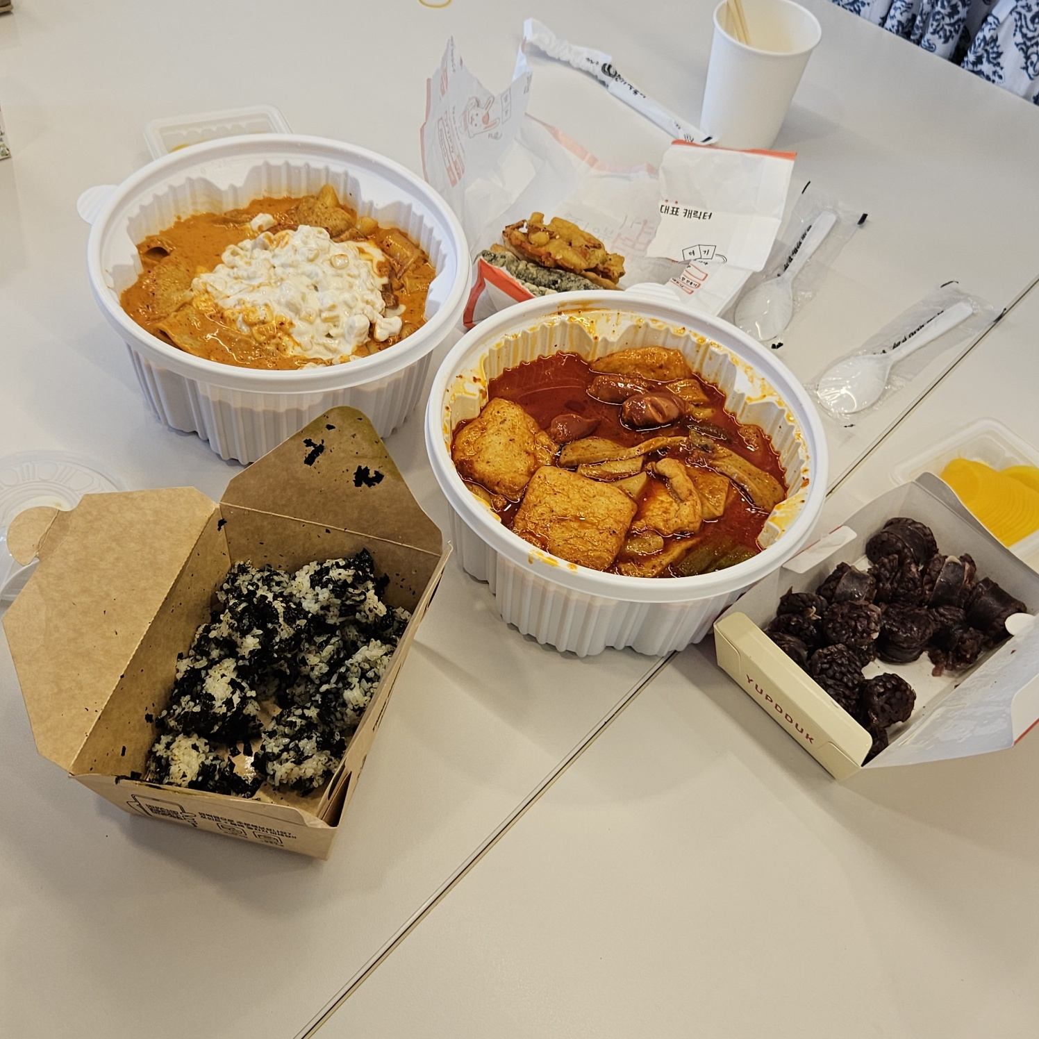* 점심 여직원들끼리 탄수화물 파티..! 마라 엽떡, 로제 엽떡에 콘마요 토핑, 주먹밥, 순대, 튀김